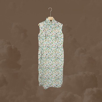 二手 古董訂製 咖米黃配色 印花 無袖 旗袍 OPF308