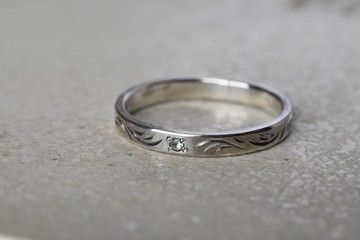 隨風飄動的稻穗從稍遠處的樹蔭下眺望著那景象感受著時間緩緩流逝陽光穿透葉隙灑落隨風搖曳、閃耀著金黃光芒的稻穗那隨風搖曳的景象也撼動著我的心我以深受喜愛的稻穗為靈感,在戒指上刻劃出紋路,並鑲嵌上一顆天然石來製作這件作品。這次選擇的是如新綠般美麗的橄欖石。與銀戒指的搭配也十分協調,成功地打造出一件無論在何種場合都能享受特別感的作品。*重要提醒*由於這款戒指經過雕刻處理,一旦開始製作後便無法進行尺寸修改,購買時敬請留意。*訂購時請註明尺寸。尺寸可訂製1至20號(以0.5號為單位)若您對其他寶石或不同金屬材質的訂製感興趣,也請隨時與我們聯繫洽詢。〜作品詳情〜*金屬・・・銀925*橄欖石・・・刻面圓形 1.5mm*寬度約為2.5mm*厚度約為1.2mm*尺寸可訂製1至20號(以0.5號為單位)*戒指上的雕刻採用日式傳統雕刻技術。『橄欖石』作為8月的誕生石,因在夜間燈光下能更加璀璨地閃耀,故有「晚宴綠寶石」之稱。它與火有著深厚的淵源,自古以來便被視為太陽的象徵。據信它擁有驅除不幸的力量,並曾被用於教堂的裝飾品。橄欖石據說能為配戴者帶來如陽光般的明媚,並教導那些容易過度否定自我或承受過大壓力的人肯定自我的重要性。『銀925』銀925(又稱:純銀)是指將銀的純度提高至92.5%,並混入銅等其他金屬的銀。純度100%的銀用於飾品時,其耐久性較低,因此市面上流通的銀飾多採用925銀。銀925作為貴金屬,極少直接向一般大眾販售也是其特色之一。與黃銅相同,銀也會因空氣中的成分而產生氧化變黑或變黃的「硫化」現象,因此若能在接觸水或汗水後擦拭乾淨,並在日常收納時避免與空氣接觸,將有助於維持其光澤。雖然可以使用拭銀布去除黑色污漬,但拭銀布含有研磨劑,過度擦拭或不慎磨損到天然石,則需特別留意。最需要注意的是泡溫泉。泡溫泉時,由於硫磺等成分的影響,銀飾會變得全黑,甚至可能無法再透過擦拭恢復原狀,因此請絕對避免佩戴銀飾入浴。注意事項關於金屬過敏等問題,敬請自行負責,敬請見諒。我們也提供重新拋光的服務。屆時請務必透過訊息等方式與我們聯繫後,再將商品以您負擔運費的方式寄回。天然石的名稱皆依據進貨商提供的名稱標示。本工作室並未進行鑑定,敬請理解後再購買。若訂購後三天以上未付款且未與我們聯繫,我們將在告知您後中止交易,敬請見諒。此作品亦在其他平台販售,情況可能導致庫存變動而無法銷售,敬請見諒。