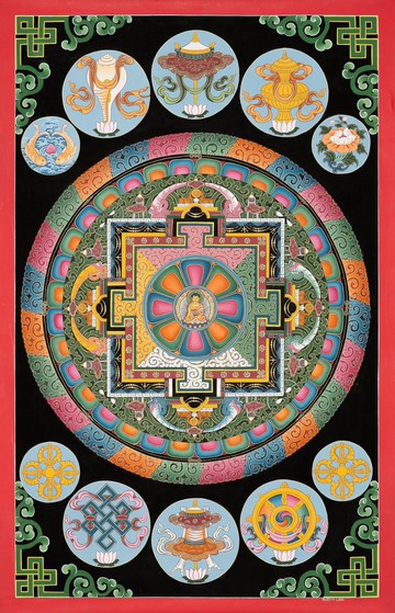 釋迦牟尼八吉祥曼陀羅唐卡是一幅神聖的圖像,中央描繪歷史上的佛陀——釋迦牟尼,置身於靈性宇宙的中心。四周環繞精細的曼陀羅幾何結構與八吉祥符號,整幅作品散發智慧、守護之力,以及覺悟的承諾。釋迦牟尼佛安坐於寧靜禪定之中,象徵覺醒意識的化身。其周圍的曼陀羅代表淨土——覺悟的聖境,引導修行者穿越層層靈性理解,向內深入。環繞曼陀羅外圍的是八吉祥符號:寶傘、金魚、法螺、蓮花、無盡結、勝利幢、寶瓶與法輪。每一符號皆蘊含深遠寓意,為觀者帶來和諧、富足與靈性進展的祝福。此唐卡由資深喜馬拉雅藝術家以虔誠之心手工繪製,使用天然礦物與石質顏料描繪於高品質棉布畫布上。傳統工藝確保每一細節不僅視覺精美,更符合靈性造像的精確規範。無論用於禪修、儀軌或神聖陳設,這幅釋迦牟尼八吉祥曼陀羅唐卡皆如一部視覺經典,引導修習慈悲、正念與解脫。對於追求內在清明與神聖臨在的修行者或收藏者而言,是一件深具力量的靈性聖物。**規格:** - 尺寸:80✕50 公分 - 由尼泊爾資深藝術家創作 - 材質:棉布畫布、天然礦物顏料 - 適用於冥想、瑜伽與居家裝飾 **裝裱選項:** - 傳統織錦可增添唐卡的莊嚴美感 - 提供多種顏色與等級的絲綢織錦選擇 - 織錦價格自美金50起,依品質與尺寸而異 **配送資訊:** - 免費運送 - 預計2至4個工作天送達,全程投保保障 **退貨政策:** - 接受30個工作天內退貨 **商店訊息:** 感謝您蒞臨我們的Pinkoi商店!探索我們豐富的唐卡系列,發掘用心製作的藝術珍品。從手工精製的唐卡到受到佛教啟發的藝術作品,這裡有適合每一位收藏者與修行者的寶藏。您的支持對我們意義重大。有任何疑問歡迎隨時向我們提出。感謝您在我們旅程中的參與。逛逛我們的商店,尋找下一件令您珍惜的藝術品吧!願一切眾生安樂!