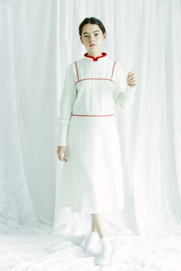 STYLE NO: #RGPF17DS3020 雙企領連衣裙- 均碼,沒有腰圍及胸寬限制。- 這是一條復古風格連衣裙,領子為雙層小企領,裡面領子較細較高。- 背後為一排布包鈕。寬鬆的裙子剪裁是蘑菇學會的定番設計。- 裙子為高腰設計,有著碎摺的腰頭、縮摺的長袖口做細節。- 袖級較長,布包鈕開口,令設計更為復古。- 袖冠蓬起,袖口縮碎摺,公主袖效果。 - 腰側有隱形拉鍊,以方便穿著。- 裙子面料為羊毛法蘭絨斜布,面料挺身稍微有彈性。- 裙子面料軟滑親膚,內有裡布,穿著更為舒適。