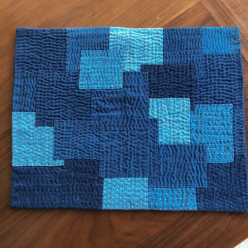 材質:亞麻工藝:藍染,刺子尺寸32*41cm照片比實物要鮮豔一些。這塊表面是拼接而成的布,底面用了一塊顏色讓時間變不勻的布。手工縫制,不是很完美,但希望你能喜歡。