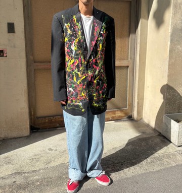 ◎可直接購買◎歡迎併購◎品牌◎尺寸◎請參考實際尺寸。◎實際尺寸衣長:前87cm 後85cm肩寬:47cm胸寬:54cm袖長:65cm此為平放測量尺寸。請見諒,可能會有些許誤差。◎顏色請參考照片。◎狀態有部分油漆沾黏痕跡,但應在可接受範圍內。無明顯破損。◎建議在素色西裝外套上大膽加入繽紛油漆的設計。內有肩墊。這絕對是獨一無二的西裝外套。由於是改造商品,請確認後再購買。若您追求全新商品般的品質,請勿購買。◎關於運送將採簡易包裝。若為可放入A4信封的薄型商品(如T恤),為抑制厚度,將直接放入信封寄出。僅限能接受者購買。◎其他此為二手古著,若您追求完美或較為敏感,請勿購買。請理解後再購買,先搶先贏。若有其他疑問,請隨時提出詢問。