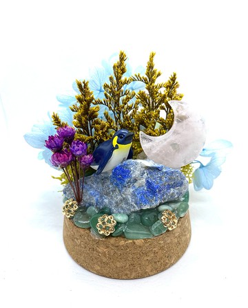 海底世界-企鵝與粉水晶月亮/青金石粉水晶:增進圓融處事、情緒和諧 ,並增加桃花與人緣。希臘神話中帕里斯小時候放牧的時,愛神阿佛洛狄忒給了他一個粉晶手鍊,上面刻著愛情語言。長大後,帕里斯遇見海倫,海倫注意到帕里斯手上的粉晶手鍊發著粉紅的光,最後帕里斯把海倫帶回了特洛伊,並舉行了隆重的婚禮,二人也成為了夫妻。青金石又稱「冥想之石」,具有平靜理性的特質,並可增強洞察力、解析力;其對應人體眉心輪,能量有助提升精神與心靈的能量,因此被認為是智慧和通往靈魂深處的寶石,是非常適合冥想的天然石。*****商品製作*****底台製作時是以綠東陵碎石鋪墊,東陵石又稱「印度玉」,為含鉻雲母的油綠石英巖,其色很美。東菱玉有療癒心靈傷口、良善本質的能量。*****手作奧秘空間*****品牌故事:在每一個小玻璃空間中,不同的時空與背景,構成不同的故事,在不同的觀看者眼中,形成一個獨有的奧秘空間。商品理念:因為喜歡扭蛋,每當打開扭蛋外殼看到喜歡的公仔,就會想像著那個他自己的獨特空間,編織他們的故事,因此激發了想在小小的玻璃空間創造一個屬於他們的場景。*****內容物*****公仔:企鵝水晶底台:綠東陵玉水晶 : 粉水晶(月亮)/青金石馴鹿草永生苔蘚乾燥花 *****尺寸*****直徑10cm x 高度 10cm x 口徑 7cm*****注意事項*****玻璃罩不建議經常打開。因其使用之材質(乾燥花及馴鹿草永生苔)較軟,打開玻璃罩會些許掉落。如打開玻璃罩需裝回可稍微內壓苔蘚處,以倒立的方向裝回,切勿太大力避免場景損毀。請注意以下事項 ^_^1.目前未提供客製化服務。2.每一項商品手工製作,只有一件。3.因為商品已製成,場景材質無法更換。IG:@eso.space7FB:@esoteric.space7