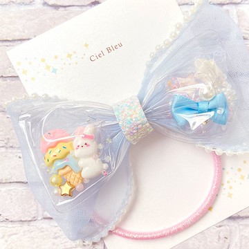 透明網紗緞帶 兔子 三球霜淇淋 淺藍色 珠光邊緣歐根紗 髮圈