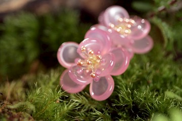 多重透彩粉晶編織製成重瓣花絲粉紅的桃花,珍珠與黃水晶模擬花柱細長,小柱頭圓頭狀。桃花在早春開放,芳華鮮美,往往成為春天來到的象徵。