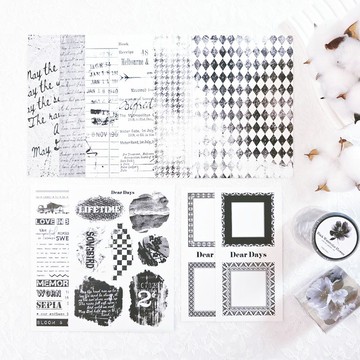 「現代黑」款式內含四張同款設計。背景字母紙尺寸為 105 x 148mm,邊框紙尺寸為 70 x 140mm,字母 PET 貼紙與點狀字母貼紙尺寸皆為 105 x 148mm,總計 40 張。和紙膠帶 無裁線設計透明 PET 膠帶,尺寸:5m x 5cm,每循環 1m (共 5 個循環) 總計提供 42 張,包含和紙膠帶。