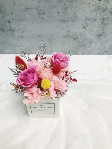 精緻的不凋花小盆花,擺放在桌上最療癒😍粉的藍的黃的紫的橘的綠的紅的你想得到的顏色都來一盆❤️//尺寸//規格//。Size:盆器6cm*6cm*6cm 成品約12-13公分(不含插卡)。主花:請私訊設計師訂製。盆器:可挑黑或白(未告知以白色盆器為主)。購買前請再次確認尺寸,切勿憑空想像,以確保自己權益哦!//花材//。主花:不凋玫瑰2朵。依照主花顏色搭配色系,另使用不凋繡球花和多種乾燥花材。如遇花材短缺,會適度調整花材運用,不影響作品風格"成品無法跟照片一模一樣,介意者勿購買(很重要)"//保存方式//❤乾燥花與不凋花需放在乾燥通風的環境,避免潮濕或陽光直射,建議定期做除濕可延長花兒壽命。(乾燥花可定期噴灑90%純酒精消毒)❤長時間擺放下的灰塵可使用小刷子輕輕刷掉灰塵或使用吹風機冷風輕吹。❤乾燥花如果發霉了,可以用酒精輕輕擦除霉菌,並靜置待酒精揮發,如大量發霉就必須將發霉的花材移除,避免影響其他花材。❤妥善保存的乾燥花可放置數月甚至數年,但仍會隨時間自然風化退色,屬自然現象哦//什麼是不凋花//不凋花源於美麗的花都-巴黎,後來流傳到日本,精通花藝的日本人,便進一步研究出能長時間保存的不凋花。隨著技術的進步,將鮮花經過脫水、褪色、乾燥、無毒染劑染色等特殊程序加工而成,不凋花能呈現出許多大自然無法自然生成的各種顏色。外觀與色澤、手感與鮮花無異,每朵都是由一朵真花製成,保有真花的型態,所以大小不會完全一樣。不凋花不但保有鮮花的特質,並能夠保值更長的時間。不凋花會因為溫度、濕度、時間慢慢的變化顏色和狀態,這也是不凋花的魅力所在!#Parmi les Fleurs#FLOWER PRIVATE CUSTOM STUDIO花。伴花藝工作室訂購須知首先,感謝您選擇花。伴花藝為您訂製花禮請您耐心了解以下須知❤花。伴花藝工作室為個人經營,所有花禮皆手工親自製作,製作約需7-10個工作天時間。宅配商品時間約為1~2個工作天 ,便利商店取件約為2~3個工作天,實際到貨日還是以貨運公司時間為主。請買家提早訂購避免延誤。❤花。伴為避免運送過程發生碰撞,會謹慎小心的包裝商品後再進行寄送,寄送過程難免會有些許花材掉落屬正常現象,敬請見諒。如收到花禮後有損壞也請拍下照片,並立即與我們聯絡處理,煩請不要直接負評反應哦!❤照片為實品拍攝,但電子螢幕與商品還是會有些微色差,介意者請勿下單。❤因手工製作與花材型態,無法要求與照片一摸一樣。如遇花材短缺,在色系與風格不變的狀況下,會適度調整花材運用。❤若需代寫卡片請於訂單備註說明,提供簡易包裝,如需精緻包裝(例:婚禮)請私訊了解。❤可依照此設計客製化您喜歡的色系,製作專屬於您的特色花禮,請您按下"聯絡設計師"與我們聯絡最後,感謝您耐心詳讀。誠心希望您在購買後給我們回饋與鼓勵。