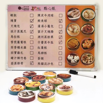 中式點心學習卡分 類:成長玩具配 件:20個膠蓋學習目標:計劃能力、視覺認知、搜查能力玩 法:1.認識20款中式點心圖案 2.認識20款中式點心名稱3.讓兒童模擬落單,選取點心,可按預算人數的份數選取