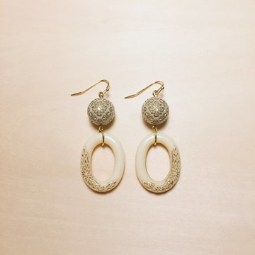 復古米白雕花橢圓耳環