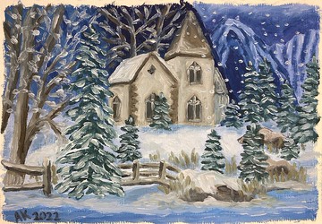 《雪夜》14x20厘米,2022年紙、油畫顏料(需要一個框架掛在牆上)藝術家 - 阿納斯塔西婭·庫爾幹諾娃環保運輸包裝(回收材料)