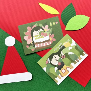 聖誕樹一直是我最喜歡的聖誕元素綠色的樹裝飾上漂亮的彩球這次的聖誕系列就是希望是這種感覺雖然沒有畫聖誕樹但遠看卻彷彿是聖誕樹一樣~https://live.staticflickr.com/65535/54086919341_b85173fb41_b.jpg延續著桌曆的「好好吃飯」聖誕系列也以食物作為主軸這麼溫暖的節日就是要大口吃甜點啊~畫的時候我自己覺得很幸福希望也能讓你們有一樣感受https://live.staticflickr.com/65535/54087374405_b48eaf7fd4_b.jpghttps://live.staticflickr.com/65535/54086042442_73791410c5_b.jpg聖誕節收到來自朋友的明信片我覺得是一件非常幸福的事或許現在大家很少這麼做但不如就從你我開始吧😊https://live.staticflickr.com/65535/54087246384_ee047970eb_b.jpg明信片相對小卡的尺寸幾乎是兩倍可以把滿滿心意都寫上去喔背面有設計淺淺的格線方便書寫 留白也很可愛~但要特別注意此系列的明信片不會附上信封!一共兩款每組都是兩款各一張喔https://live.staticflickr.com/65535/54087167403_72bde9fa95_b.jpg這次也有推出全系列的套組希望你們會喜歡!