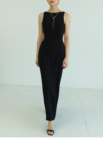 復古一字領赫本風垂墜感 無袖露背高腰長連衣裙/洋裝