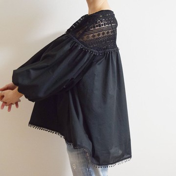 以100%純棉與觸感柔順的蕾絲拼接而成,寬鬆的袖圍採用了煙管褲設計。擁有能遮蓋臀部的長版設計,以及如氣球般的袖子輪廓,是一款蓬鬆溫柔的罩衫。長袖袖口採鬆緊帶設計,可依個人喜好調整袖長。搭配高領內搭等,也能融入冬季穿搭,幾乎全年皆可著用。★尺寸請選擇您想要的尺寸。・胸圍 (適用 72cm~80cm)・衣長 (前) 約70cm(※可能會有些微差異)・胸圍 (適用 79cm~94cm)・衣長 (前) 約72cm(※可能會有些微差異) ※模特兒著用尺寸・胸圍 (適用 93cm~108cm)・衣長 (前) 約74cm(※可能會有些微差異)★模特兒/人台著用尺寸※模特兒身高165cm, 體重53kg實際測量尺寸 (M~L號) (平放狀態下測量)・胸圍 52cm・領寬 約21cm・前領深 約8cm・裄長 約78cm・前衣長 約72cm★材質・棉100% 珠棉・蕾絲部分 聚酯纖維★規格開口 套頭式 後鈕釦×1袖子 鬆緊帶設計 (內有可替換鬆緊帶的開口)《請注意》・此為訂製商品。・尺寸部分 請於選項中選擇您想要的尺寸。若有任何不明之處,歡迎隨時洽詢。・確認付款後,將進行布料採購與製作。商品將陸續出貨,但自確認付款至出貨,約需3週(工作日)時間,敬請見諒。・因材質較為細緻,建議手洗或乾洗。・若使用家用洗衣機,建議放入洗衣袋,並使用專門清洗絲綢衣物的洗劑,選擇柔和水流模式(如手洗模式、乾洗模式等)進行清洗。・建議內搭細肩帶背心等衣物後再穿著。