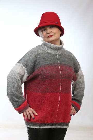 該款採用超大款式針織,袖子加長,適合任何尺寸,最大可達 XXXL 和身高。毛衣採用無縫針織,領口、袖口和下擺採用空心鬆緊帶針織,前片和側片有仿線縫。這件毛衣非常柔軟、輕便、溫暖、舒適。從灰色到紅色的色彩過渡非常漂亮。