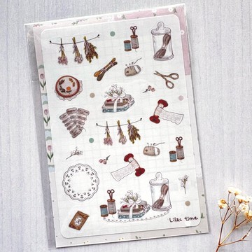 在類似和紙膠帶的紙質素材上印刷插畫,並進行半切處理。請用於手帳裝飾等用途。具有透光性,容易與筆記本或紙張融合。尺寸為 9×13.5cm 的一張貼紙使用家用印表機印刷。