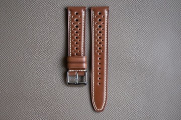 **Horween 波本色馬臀皮 復古競賽風格錶帶 (訂製款)****主要特色**• 美國 Horween 波本色馬臀真皮;• 法國 Zermatt premium 低過敏性防水萊茵皮革內襯;• 加強四層結構設計,抗拉伸、防變形,大幅提升錶帶使用壽命;• 堅固的手工馬鞍縫線;• 可靠的不鏽鋼五金配件。採用纖薄填充設計,帶有透氣孔(復古競賽、賽車風格),錶帶靠近錶殼處厚約 3.5 公釐,孔洞處及錶扣端厚約 2.5 公釐。若您希望客製化您的錶帶,請參閱下方可選的客製選項,並與我們聯繫瞭解詳情。**客製選項****錶帶長度**我們可根據您的實際手腕尺寸為您挑選錶帶尺寸。請參考以下建議測量手腕尺寸的方法:1. 手部請保持張開(手掌與手指伸直)。2. 請在您平時佩戴手錶的位置測量手腕尺寸。3. 您可使用裁縫捲尺、紙條或專用的手腕測量工具。4. 測量時請勿過緊或過鬆(無需預留額外空間)。您也可以沿用現有任一條您覺得佩戴舒適的錶帶的長度。請告知我們錶帶兩部分的長度。例如:115/75 公釐(115 公釐為帶孔部分錶帶的長度 / 75 公釐為帶錶扣部分錶帶的長度)。**錶帶末端造型**您可以選擇以下幾種錶帶末端造型:• #1 (尖頭)• #2 (圓頭)https://ia.wampi.ru/2022/04/18/ShapeOfStrapPoint.jpg**縫線顏色**預設將使用廣告照片中所示的縫線顏色。所有可選的縫線顏色:• 同色系(縫線顏色將與主要皮革顏色相配)• 亮色對比(縫線顏色將比主要皮革顏色明顯更淺)• 柔和對比(縫線顏色將比主要皮革顏色稍淺)• 指定顏色(請告知我們您想要的顏色)**錶扣**預設將為錶帶配備廣告照片中所示的相似類型錶扣,顏色為拋光鋼色。金色、玫瑰金色和黑色需另外要求。https://ie.wampi.ru/2022/04/18/Buckles_1v2.jpg**連接配件**預設將使用與列表中錶帶類型相符的選項。所有可選的連接配件:• 標準彈簧桿• 快拆彈簧桿(需額外付費)https://ie.wampi.ru/2022/04/18/QuickReleaseSprinBars.jpg• Apple Watch 專用接頭(僅適用於 Apple Watch 錶帶)https://ia.wampi.ru/2022/04/18/ClassicAppleWatchAdapters.jpg• 沛納海腕錶專用管(僅適用於沛納海腕錶錶帶)https://ia.wampi.ru/2022/04/18/PaneraiTubes.jpg