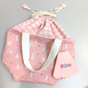 附姓名吊牌。莫蘭迪粉兔。幼兒園小學適用 可機洗束口便當袋 餐袋