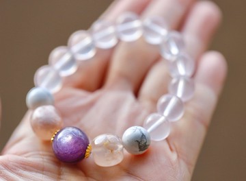 【紫月】招桃花三寶:玫瑰石、粉晶、月光石紫鋰雲母又稱「變革之石」、「情人石」,綻放銀紫色閃光~與溫柔的愛與喜悅共頻,吸引美好的緣份。♡ 能量:粉紅、心輪、桃花人緣、愛情、幸福、喜悅、溫柔、好運、尊貴♡ 材質:貓眼紫鋰雲母、天然芙蓉粉晶、紫櫻花瑪瑙(內含花如照片)、白松石、18K包金黃銅、日本蠶絲彈性線::訂購注意 (若現成尺寸非您的手圍,可以另外客製)* 訂購後請務必跟我們確認您的手圍, 以加速製作進度。請參考以下『商品尺寸丈量方式』。由於尺寸不同,可能需在作品設計主題不變的前提下,於材料與配件上有所增減。例如較短的手圍,會需拿掉某幾顆配珠,較長的手圍則會添加幾顆珠子或配件等等,因此亦有酌收材料費的可能。實際佩戴效果請參考佩戴情境照片所呈現之比例。* 我們挑選的每件天然礦石、木珠、珍珠等材質皆有自身獨一無二的紋路、色澤、形 狀,天然礦缺或冰裂紋亦是自然造物的一部分,我們會盡量為您挑選製作以符合照片中呈現的同等級美感,但無法保證是百分之百跟照片一樣,希望您理解並同樣欣賞每件飾品獨特的個性美與緣份,若無法接受請勿下訂喔!* 商品照片皆於自然光下拍攝,可能會因光線環境或電腦/手機螢幕設定不同有些微色差。請盡量參考不同角度的各張照片所呈現出的實體效果,恕不接受關於色差方面的退換要求。* 一般接單約1-3工作天可完成製作並寄送,(除材料短缺或特殊情況可能需7-10天),如急件請先註明,若無法於您期望的時間前完成,我們會先告知。--------------------------------------------------------------------::商品尺寸丈量方式使用布尺或容易取得的軟性線材,貼合圍繞手腕骨突出處(腳鍊則量腳踝關節處)一圈後平放並測量長度。我們在製作時會依此數據計算適合您的實際尺寸( 請不要自行預留佩戴鬆度空隙)。例如彈性手環(+1-1.5cm) 與扣環手鍊(+1.5-2cm) 會略有不同。若因尺寸丈量有誤而需重製,則需自行負擔運費更換。--------------------------------------------------------------------::禮物包裝*致贈親友請註明,可免費代為包裝直接送禮,禮物盒採用牛皮色硬紙盒(內有絨厚墊)、打麻繩結,如圖。*免費代寫禮物小卡,請事先註明並提供文字(中、英、日文皆可)。--------------------------------------------------------------------::客製化歡迎來信說明您的需求、喜好,我們可以提供專屬於您的客製化設計商品。或可預約星座諮詢分析。--------------------------------------------------------------------::售後服務 提供所有商品購買日起一年內免費維修重串(順便整理、保養、淨化)二次。若商品有缺損請先告知,在有備材的情況下可免費替換一次,若需酌收材料費會告知。請小心保護好商品後寄回給我們,運費需自付,恕無法擔保寄送時遺失或毀損的風險。--------------------------------------------------------------------::使用及保養方式* 天然礦石淨化方式可參考網路上的建議,最簡易的是置放於日光(或滿月)光二小時。商品出貨前,皆會先為您做一次能量淨化。* 洗澡或泡溫泉、海水時建議先將飾品取下,以避免受損。* 有時會因部分捲曲造成彈性線外露或卡住,可用雙手輕拉調整並盤順幾遍手環上的每個珠子,大多數情況下即可恢復平順。* 含金屬的商品長時間不配戴時,建議以夾鏈袋封存,能減少氧化。* 黃銅、純銀氧化變黑屬正常現象,可用拭銀布擦拭恢復光亮。* 天然黃銅可用濕棉布沾檸檬汁或醋擦拭至光亮,如商品為複合式材質,例如含有木質、天然珍珠等需避開,可用棉花棒或小牙刷小面積分開處理。