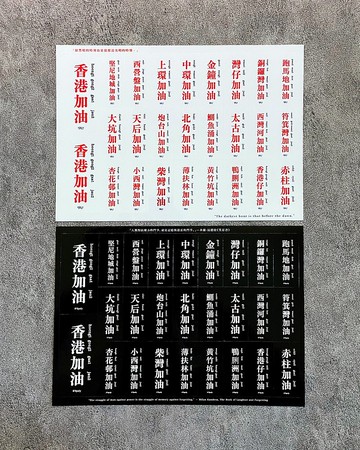 香港加油貼紙(*過了光膠更耐磨耐曬)Size: A5 (14.5x21cm)售價:$48HKD (一套 紅藍字白底 跟黑底白字各一張)用多一點點的幽默感來釋放對這荒誕無稽的社會所帶來的負能量。笑一個也就是給自己打一個氣。香港人,加油!