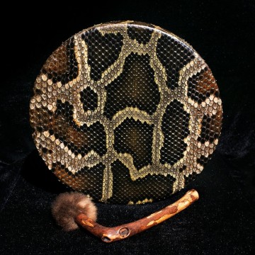 UltreyaDrums設計師設計純手工製作 蛇皮薩滿鼓鼓面由密集的蛇皮鱗片所覆蓋呈現出天然獨有的蛇皮紋路後背抓握採用帶毛黑山羊皮纏裹整鼓色澤暗沉音色厚重搭配烏木黑羊毛鼓槌極具神秘 力量感適合演奏 收藏此款薩滿鼓內置調音功能即便在潮濕的環境中也能正常演奏\t產品規格:16-20英吋鼓面直徑:40-50cm購前須知:此款薩滿鼓無存貨,接受客製(客製週期為四周);獸皮具有獨一性,不同批次的獸皮紋路、色澤均不相同,產品包含鼓槌一根(每根鼓槌都由設計師打磨製造,極富美感)