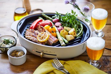 可用於烤製肉類、魚類及蔬菜的坑紋烤盤,具有傾斜的烤紋,在烤好後再旋轉90度即可烤出漂亮網紋。坑紋有助流走食物多餘的油脂,讓料理更健康。