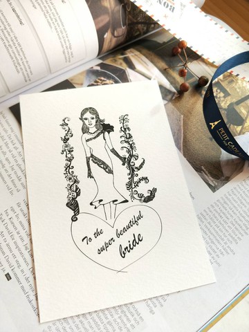 Arpourtin 原創手繪明信片【購買金額】環保及成本考量,購買金額需滿 NTD100 (不含運費)才為您出貨。若購買金額未達NTD100,屆時將協助您取消訂單或更改訂單,還請您見諒。【免運費】下單滿 NTD1000 免運費(限台灣寄至台灣)。【明信片語彙】To the super beautiful bride給超級美麗的新娘【商品描述】富質感的美術紙,吸墨性佳,書寫順暢。【關於退貨】請恕以下事由無法為您辦理退貨:1.螢幕色差。2.個人因素。 (例如:對商品喜好改變等事由)貼心提醒您,館內商品多為水彩渲染印刷品,為呈現商品美感,色彩飽和度如商品圖示。又考量紙張易損之性質,出貨前我們會詳查商品,以確保商品品質。為保障雙方買賣權益,請您於下單前,務必詳閱商品圖。非上述事由,商品有任何問題欲辦理退貨,請與設計師聯絡,謝謝您。 © Arpourtin. All Rights Reserved.