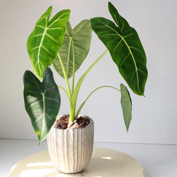 **絨葉觀音蓮**** *Alocasia micholitziana*⦿ 植物絨葉觀音蓮是屬於天南科觀音蓮屬屬,又叫做綠天鵝絨海芋,因為葉片像天鵝絨布的霧面質感,是蠻好養護的觀音蓮品種,不能強曬,散射光最適合 ⦿瓶器選擇搭配絨葉觀音蓮的是特別特別耐看的創意水泥盆,瓶口有小幅度的高低變化,瓶身凹凸剛好好看的修長條紋,整盆高度有40~50公分瓶器尺寸開口直徑 : 14 公分高度 : 13 公分 ⦿日照觀葉植物最好都放在散光環境,所謂的散光環境就是不是直射光,有遮蔽物的概念,比如是窗戶旁邊或有遮蔽的陽台;有些植物特別需要強光,有些植物耐陰性特別強, 絨葉觀音蓮則是標準散射光最適合 ⦿給水方式很多人問我們到底要怎麼給水?? 我們都強烈建議不要用澆的,用水盆放在植栽下方讓它自動吸水,待一兩個小時過後,再把水盆拿掉,這是一種最自然的給水方式,讓植物的根系自行吸收水分;多久澆一次水也是人們常問的,只要你摸土乾了或者植栽重量整個變輕了,就可以放上水盆讓它吸水,所有的植物都是一樣的窩當然我們也建議要適時的給植物補充營養,一個月給一次到兩次營養液是很洽當的窩,只要把營養液滴在水盆哩,一百CC一滴讓植物根系自動吸收就可以囉⦿禮品包裝方式如果是要選擇送禮, 不用特別加收費用,我們會在植栽上綁上好看緞帶;有送禮需求者備註說明就可以窩