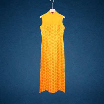二手 古董訂製 橘色 拼接 刺繡 無袖 旗袍 CA801