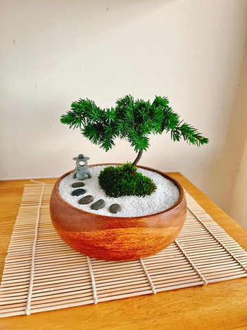 購買與提問前,請先詳閱商店公告商品故事:木器中的禪庭盆栽,小松樹矗立其中與石燈呈現出枯山水的意境,讓環境充滿禪風。 商品用途:室內擺設或辦公室佈置或送禮 商品尺寸:竹簾約21.5cm x 24cm,木器約直徑15.5cm x 高5cm,含植物高約16cm不等 商品材料 : 植物(松、青苔)、石頭、pvc石燈(若pvc石燈缺貨,會以更高級的石材石燈代替,如倒數第二張照片右邊,和最後一張)、白沙、介質、木器、竹簾 注意事項 : 1.植物是活的,所以需要陽光和澆水,避免長時間直曬 2.運送過程有可能使商品擺設亂掉(宅配狀況會好些),收到後可能需要些微調整,另外包裝採多層包裝,所以會先將植物以外的物品放平稍微壓入沙中(石燈不會壓入,會另外放),使其固定性更高,拆封時亦須小心,避免傷到植物或整個打翻,收到再將物品調整即可 3.因為手工製作,每次製作的成品可能會與照片些微不同(可能有些微瑕疵,完美主義者需三思) 4.植物與青苔有可能會因缺貨替換其他類似植物(每棵小松樹茂密程度與形狀不同,完美主義者需三思) 照顧方式 :1.植物在高溫時不能在白天澆水,高溫會讓水變熱,等於在燜煮植物的根 2.一般澆水最好曝氣過,水比較不會偏鹼導致土壤板結透水性不佳 3.澆水過多會把根泡爛,適當勤勞適量的澆水才能顧的久(每2天均勻澆水50ml於青苔表面) 4.光線要全日照的散射光,並放在通風良好的環境,避免直曬與通風不良