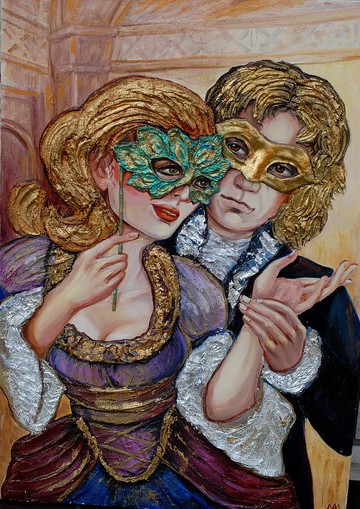 丙烯畫威尼斯狂歡節化妝舞會情侶戀愛手繪