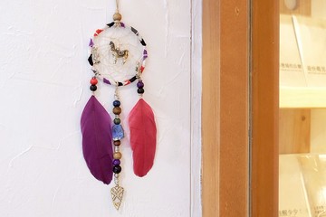 捕夢網是印地安人的幸運物,古老印第安人相傳捕夢網可以將惡夢從網中捕獲, 將好夢透過羽毛下滑到夢境之內`. 傳統上當有小朋友出世時, 部落裡既長輩就會送一個給小朋友. 寓意一個衷心的祝福,並希望可以幫小朋友將惡夢過濾, 只留下美夢,健康快樂成長。而現今都市人大多都會因睡眠質素欠佳而影響日常生活,大家不妨送一個給朋友及至親,給予一個衷心的祝福,希望他們瞓得甜甜蜜蜜,而且仲可以當作屋企一個小掛飾, 作美化家居。由於吊飾為天然水晶,所以形狀大小會不一, 每個石子也是獨一無二。 材質:毛冷/麻線,棉線,天然晶石,羽毛,木珠長度:約27cm, 圓約7cm(直徑)歡迎客製化:想要更改外圈, 吊飾, 羽毛,木珠,水晶石材,顏色等,歡迎向我們查詢.隨作品會附上卡紙包裝, 包裝除了可以把捕夢網安全送(寄)到收件人手上, 更加可以經摺疊後成為座檯擺設, 令作品多了除掛牆外的選擇, 背面更附上年曆同心意卡, 將你的祝福心意悄悄送給對方。使用方法~https://www.youtube.com/watch?v=Pd8_QLO5v3g