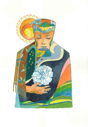 地方系列相關創作,將我愛的山河轉譯為自然神祇。***大尖山——我的故鄉是雲林,大尖山為大湖口溪的源頭山,臺灣小百岳之一 還記得走訪這山,一路霧煙裊裊,順坡而下的大片梯田忽隱忽現,茶農的談笑聲亦在山間點綴了朝氣,那盛開的白山茶啊,綻放成心中的香 崇敬著山的壯闊。山神是穩固的能量,涵納著生靈的秘密耳語。
