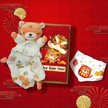 帶財福虎舞獅 口水巾/三角巾+安撫娃娃 新生兒禮盒-長袖連身衣-紅