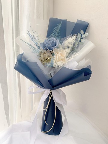 永生花花束--藍色星空 寧靜的深藍色星空裡,有著微光閃爍的小星星 仰望時,能讓繁亂的心平靜 與家人、情人一同觀星的回憶 總在茫然迷惑時,悄悄地提醒自己並不孤單 『藍色星空代表著寧靜、微光與陪伴』* 尺寸:大的40cm*25cm、中的35cm*20cm,手工製作,難免落差。* 材料:日本進口永生玫瑰(大的2朵、中的1朵)、繡球花、卡斯比亞、蓬萊松、樺木葉、芒萁。花材有缺時會替換相似花材。永生花材難免有小破損、斑點。* 花束體積大,一筆訂單只能裝1束,超過請分開下訂。* 如需收據,請於訂單備註說明抬頭、運費是否納入。售出後不提供。* 備貨日為2天,寄出後,無法控制後續物流配送時間,請自行斟酌。* 附贈提袋、保存說明卡、萬用小卡。萬用小卡若要換為我愛你小卡、生日小卡、母親節小卡、畢業小卡、感謝小卡,請於訂單備註。* 花束內可以免費加入迷你學士帽,如有需要,請於訂單備註。