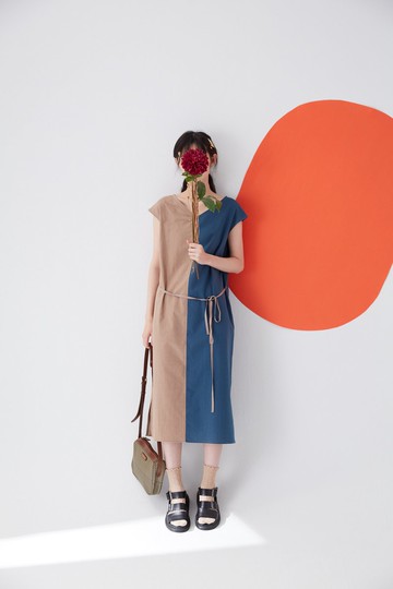 深藍裸色V領對稱綁帶洋裝