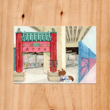 "小狐與香港街道 - 玉器市場"水彩插畫明信片