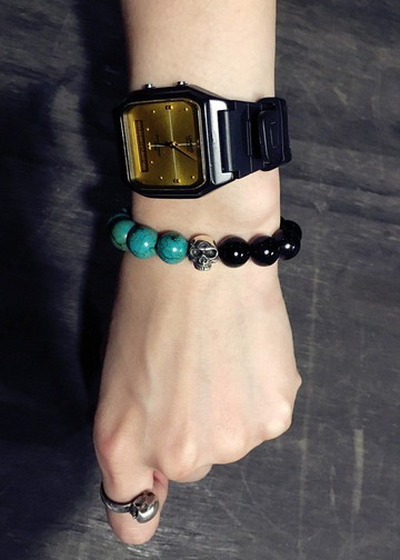 尺寸 | SIZE適戴手圍約17~18cmIt is suitable for 17~18cm wrist.若有其他手圍需求請告知我們。飾 | 925純銀骷髏High:11mmMaterial:925 Silver & Bead局部硫化做出漸層質感繩體 |彈性繩&黑瑪瑙‧綠松石使用及保養方式:配戴飾品請勿用力敲擊、拉扯硫化處理之銀飾請勿使用洗銀水清洗請避免於泡溫泉,劇烈運動,泡澡時配戴保養使用附贈之擦銀布或一般眼鏡布擦拭即可長時間不配戴時可將飾品裝進夾鏈袋中防止飾品氧化內附:保證卡一張擦銀布一條絨布袋一個設計與製造:所有商品從設計到製作皆純手工完成(不包含鑄造 雷射刻字等)購買須知:此商品為訂製商品,確認付款後約需14個工作天以上,無法等待的顧客請斟酌後再下標。接受手工刻字服務,可選6~9個英文字母,手工刻字費用另計。提供一年免費保養及維修服務,不包含人為破壞因素,買方需自行負擔寄回之運費。此產品為客製化手工製造,恕不接受任一退換貨原因,若有任何疑慮請來信詢問,我們會盡快為您解答。商品以實物為主產地/製造方式台灣手工