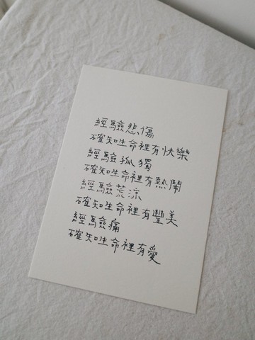 經驗悲傷確知生命裡有快樂經驗孤獨確知生命裡有熱鬧經驗荒涼確知生命裡有豐美經驗痛確知生命裡有愛/經驗只是一種生命的體驗如何賦予體驗意義才是真正重要的事情。/瑪芬紙約11*15公分