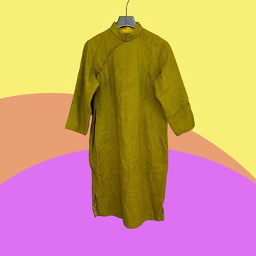 二手 古董訂製 橄欖綠 毛料 開衩 厚重 七分袖 旗袍 CA404