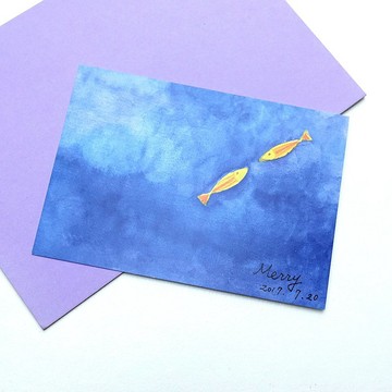 原創風景水彩畫明信片 寧靜海的海豚
