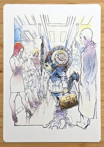 【都市怪物系列】01蜘蛛女。楊鈺琦。日本水彩紙。14.8*21cm。售完不再加印。以前搭捷運上下班時,我會隨手畫一些塗鴉。不同面貌的乘客激發出我的靈感,讓我開始發展出這一系列的5張圖。