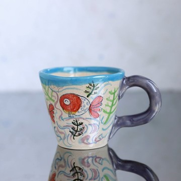 陶器直徑8.8厘米高度8厘米這是一個手工彎曲而不使用鍋的杯子。幽默的金魚畫是手繪,有品味和耗時。圓形手柄為紫色,內部為透明釉,邊緣為淺藍色釉。