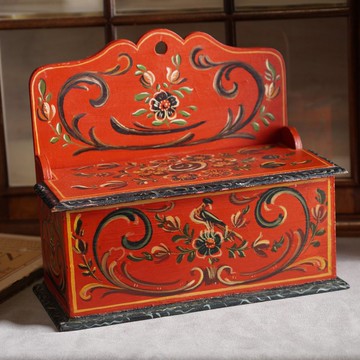 手繪置物盒為荷蘭北部濱海小鎮著名的Hindeloopen風格設計,帶有精緻的手繪小鳥與花朵圖騰,底部也有漂亮的手繪圖,頂部有穿孔也可將其掛於牆上使用;可擺放鑰匙或是小物使用。置物盒有使用與歲月痕跡,例如:表面痕跡以及左側蓋子角落有一處損傷;詳細狀況可參考其他照片,若有未敘述到的細節請以照片為主。✅尺寸:27cm (W) x 12cm (D) x 23.5cm (H)✅材質:木頭✅產地:荷蘭//關於Hindeloopen//著名的Hindeloopen繪畫風格的起源於17世紀荷蘭北部Friesland省(菲仕蘭省的)一個迷人濱海小鎮(Hindeloopen),以往是一個重要的貿易港,早期荷蘭船員常從挪威帶回有名的Rosemaling畫風的彩繪木製品, 這些彩繪圖案常可在小鎮上大部份的住家門口或是牆上看到。Hindeloopen風格以手繪的鬱金香、玫瑰、雛菊、康乃馨等花朵搭配花環、飾條、捲軸等圖騰,此風格主要用於家具,並以紅色、綠色或藍色背景上的複雜花朵圖案而得到認可。老件非新品有使用與歲月痕跡,輕微刮痕等為正常狀況非瑕疵,請謹慎考慮後再購買喔!