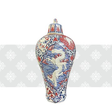 元 青花釉裡紅開光龍鳳紋八角梅瓶通高:53.5 cm底徑:14.3 cm\t口徑:6 cm梅瓶胎骨厚重,小口平沿,頸細短。 瓶身修長,有八稜。 肩飾一周大如意雲頭紋,內繪鳳或麒麟穿花.海浪等圖樣,瓶身中部白龍鳳紋,襯以青花海水和火焰紋,近足處飾一周如意 雲頭紋,內繪花卉枝葉。胎骨細膩潔白,釉質滋潤透亮,青花色澤濃艷,元代的青花瓷器形制豐滿而宏偉,紋飾繁密,層次豐富,構圖嚴謹。相較於唐宋時期瓷器花紋簡潔的傳統風格,元代的製陶藝術採用了工細的描繪和複雜的層次,形成了花團錦簇的獨特風格。器肩和近足處巨大的青花雲頭紋受到元代絲織品披肩圖案的啟發,而龍紋的大量出現則是這一時期瓷器裝飾藝術的一個顯著特點。整體形制宏偉,充分展現了元代工匠卓越的成型技巧。購買須知:本館商品皆為十年以上的收藏品,時間久遠可能會有老化痕跡,如氧化、掉漆、刮痕等屬於正常現象。若您極度追求完美,建議慎重考慮。我們會盡力提供詳盡的品項描述和現況照片,請買家自行判斷物件價值。古董商品無保固期也無鑑賞期,售出後恕不接受退換貨。包裝上的錦盒/紙箱因收藏歷久非全新,可能積灰、脫線、老化,如無法接受請勿下單購買,感謝您的理解。#本館商品皆只有一件,如對現況照片有所疑慮,請勿下單,沒有相同商品可提供換貨服務。#尺寸均為手工測量,若有些許誤差敬請見諒。