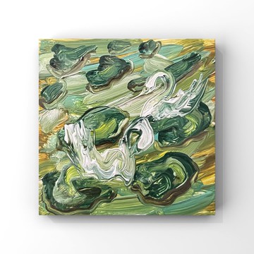 荷花池上的優雅天鵝藝術紋理抽象油畫,綠色色調,4英寸