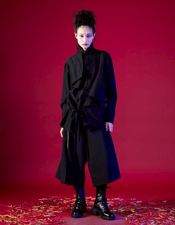 **2023SS《Kî-Tó》**https://images.squarespace-cdn.com/content/v1/568d0036dc5cb4a5b51b342a/f3b5561b-0845-4c04-961a-1e3443278cef/INF+23SS%E3%80%8AK%C3%AE-T%C3%B3%E3%80%8B.jpg?format=1500w|**設計**|本季以炮炸為設計理念,將正統版型不斷的拆解重塑,勾勒出多款延續同心圓結構,同時承襲品牌擅長的解構風格,再次呈現「一衣多穿」的變形機能設計。品牌也持續在男性與女性的代表服飾間互相解構重塑,於性別開放的今日,開啟了更多柔美氣質的洋裝與露背款式,同時也持續維持經典暗黑風格的品牌DNA。服裝版型較以往品牌經典款的長版襯衫不同,以正式襯衫的視覺輪廓為基底,設計上由身片解構出雙層擋片,利用褶紙藝術般的技巧,再不斷反摺後製造出不規則多層次的視覺效果,並在兩側延伸出綁帶,透過綁帶讓正面視覺層次更佳豐富,也能讓綁帶自由垂墜於兩側;領子上特別做立領設計,讓整體氛圍帶點休閒感,更能多樣式搭配風格。此款襯衫可以搭配品牌經典日式解構寬褲,讓整體穿搭層次在視覺上,更加豐富有設計感。|**靈感**|相傳清光緒年間(1885年)鹽水發生大瘟疫,民眾祈求神蹟降臨,沿途燃放炮竹直至天明,遶境結束後,鹽水疫情就此消退,民眾感念神恩,每年元宵夜沿襲成例,演變為今日之鹽水蜂炮盛會。本季以鹽水蜂炮為題,翻玩服裝版型、印花,大量採用致敬蜂炮綻放的同心圓版型,散射與收束的結構,並將蜂炮施放瞬間的樣貌以數位繪製捕捉呈現;版型上承襲INF品牌獨有特色『一衣多穿』,打造出多款延續同心圓結構變形的機能款設計;除了以INF的結構特色翻玩台灣文化鹽水蜂炮外,更是與國際藝術家合作,打造出透過聲光、數位科技重現出宛如置身在砲陣中的藝術裝置,倡導了一種零污染、更環保的蜂炮展演形式。身處在後疫情時代,INF透過時裝與蜂炮文化的結合,倡導當年蜂炮遶境驅散疫情、撥雲見日的理念,本季主題《Kî-Tó》正式由臺語發音的祈禱一詞,祈禱透過本季的數位時裝蜂炮,也能為我們驅散疫情的尾聲,再度樂活。https://images.squarespace-cdn.com/content/v1/568d0036dc5cb4a5b51b342a/fd795067-09b5-45be-84d0-8d4930f021b9/KTS16-B+%281%29.jpg?format=2500whttps://images.squarespace-cdn.com/content/v1/568d0036dc5cb4a5b51b342a/5c3fc7d4-1010-4485-8d87-205d3f648530/KTS16-B+%283%29.jpg?format=2500whttps://images.squarespace-cdn.com/content/v1/568d0036dc5cb4a5b51b342a/e6e99546-c6fe-473f-89b1-e5dfac8f1322/KTS16-B+%284%29.jpg?format=2500whttps://images.squarespace-cdn.com/content/v1/568d0036dc5cb4a5b51b342a/b98591b7-2851-4535-9bd5-aee0d32a73a2/KTS16-B+%285%29.jpg?format=2500whttps://images.squarespace-cdn.com/content/v1/568d0036dc5cb4a5b51b342a/171322ef-cc3f-4c92-98de-cd7b5975b859/KTS16-B+%282%29.jpg?format=2500w|**材質**|棉 73%尼龍 27%|**顏色**|黑|**洗滌方式**|可機洗低溫整燙不可漂白不可烘乾** INF 23SS臺北時裝週品牌秀 **https://youtu.be/ej5VcfOad5s