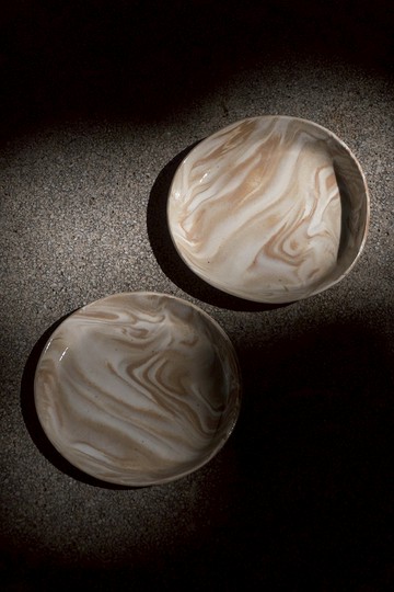 黃陶,信樂土和瓷土經過練土、混土、拉坯、修坯成形,完成攪胎作品。每一件攪胎作品都有不同的紋路。沒有上釉的抷體在經過釉燒後,再經過研磨,讓使用者能夠觸摸到陶土的肌理。這件作品使用電窯燒製。燒成溫度為1240度。/ 材質 /黃陶,信樂土和瓷土/ 尺寸 /長x 寬 x 高: ~14cm x ~15cm x 1.5cm重量:145g, 175g手工製造,不會很完美,尺寸存在加減0.5cm的誤差介意的朋友請斟酌購買/ 顔色 /棕色,米白色實物顔色會因爲螢幕色差而有所差異,顔色以實物爲準。使用前注意1. 運送用的裝材皆為再利用材料。2. 陶瓷器若是作為食器使用,在使用前務必以沖洗數次後再使用,清潔表面上的髒污。3. 釉藥在燒結時都會有一些瑕疵。如有細微針孔、釉藥裂紋(不是陶土上的裂痕)和縮釉都屬正常現象。如何保養陶瓷器一件陶瓷器如果保養得宜可以留傳千年,所以在使用的時候也要多多留意喔。1. 陶瓷器一般都可以在微波爐和洗碗機使用。除耐火土制成之作品,儘可能不在烤箱內使用,以免造成釉藥產生裂紋。2. 清洗時勿用鋼絲刷,使用海棉配搭洗碗精清洗即可。3. 一般的陶瓷器具都不適合在明火下使用,某些釉藥會在受熱後(如泡茶)會產生裂紋,屬正常現象。4. 咖啡和茶會滲入釉藥表面之裂縫留下棕色的痕跡,不喜歡的朋友可以在飲用咖啡和茶後馬上清洗器具,減慢茶水滲入裂縫的速度。5. 在沒有上釉的作品(或露出土胎的部分)是像海棉般的多孔材質,長期使用後因為人手上的油脂滲入而變得亮亮的,這是正常現象。6. 幾件陶瓷器放在一起時要注意不要大力擠壓到它們,雖然釉藥都很硬,但是也很脆,有時候這樣做會造成一些不必要的裂痕。