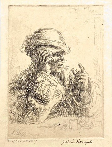 藝術家介紹_Julius Komjati 是督察的兒子,出生於匈牙利。 1911 年,他在布達佩斯獲得教學文憑,並於 1914 年進入美術學院。第一次世界大戰期間,他應徵入伍,回國後被授予學院設計教授文憑,並於 1920 年創作了他的作品第一次蝕刻。 1927 年,Komjáti 獲得獎學金前往英國皇家藝術學院師從馬爾科姆·奧斯本(Malcolm Osborne) 學習,並於1928 年抵達英國。接下來的十年他在英國度過,在此期間創作了一系列精湛的作品,大約有74 幅版畫,由倫敦的 H. C. 狄更斯出版。 他的作品受到高度評價,以至於他成為少數入選英國皇家畫家版畫家協會的外國藝術家之一。_商品資訊作者:Julius Komjati (1894-1958)。 名稱:匈牙利藝術家 Julius Komjati 蝕刻版畫 - 戴帽的男人 1929。 年代:1929 。裱褙尺寸:21.4 x 25.2 cm 。 備註:裱褙作品。**老件難免有歷史痕跡,如圖顯示, 能接受者再購買