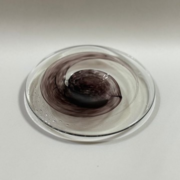 寬約17公分、高約2公分,重量443克。盤面中央向內微微凹陷,玻璃中旋繞著黑色渦紋,並散布細小氣泡,呈現如夜色水面般的深邃視覺感。適合作為甜點、水果或飾物陳列盤,單獨擺放也十分耐看。