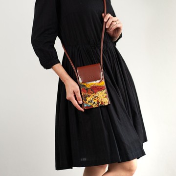 這款手機包選用真皮製作,設計簡約而精緻。包款上的圖案皆為獨一無二的手工刺繡,每一件都是世界上僅此一件的珍品。此款靈感來自名為「Wildflower」的作品。• 可斜背• 採用納帕皮革與麂皮內襯• 正面為刺繡布藝• 磁扣翻蓋設計• 背面設有卡片夾層• 皮革背帶長 54 公分• 可容納最大尺寸為 16 x 8 x 1 公分的智慧型手機尺寸:高 18 x 寬 10 x 厚 1-2 公分刺繡細節:「Wildflower」—— 以母親與孩子為主題的刺繡,著重於母親飄逸的長髮。此作品巧妙結合了 70 年代和 80 年代的復古布料,並以絲線與輕薄布料繡製而成,營造出如同野花盛開的花園般的視覺感受。